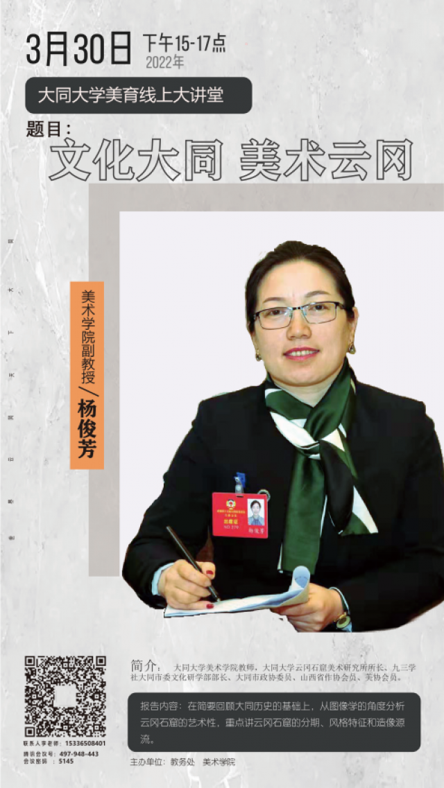 题目:文化大同 美术云冈 演讲人:杨俊芳 大同大学 时间:2022年3月30日(周三)下午3:00-5:00 腾讯会议号:497-948-443 会议密码:5145 |