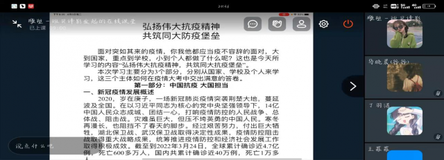 学院党委副书记宋睿媛组织18级环境设计班、18级雕塑设计班和21级绘画三班的学生通过腾讯会议的形式进行线上专题宣讲,重点就中国担当、同心抗疫课不容缓、青春正当时等方面与学生进行了交流指导。