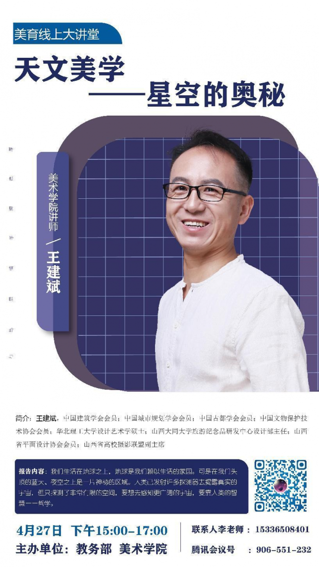 题目:天文美学——星空的奥秘 演讲人:王建斌大同大学 时间:2022年4月27日(周三)下午3:00-5:00 腾讯会议号: 906-551-232 会议密码:无