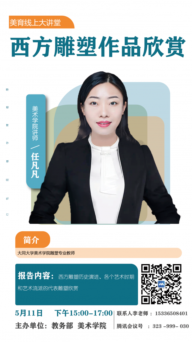 题目:西方雕塑作品欣赏 演讲人:任凡凡大同大学 时间:2022年5月11日(周三) 下午3:00-5:00 腾讯会议号:323-999-030 会议密码:无