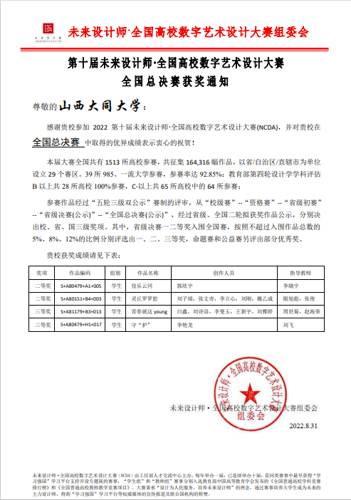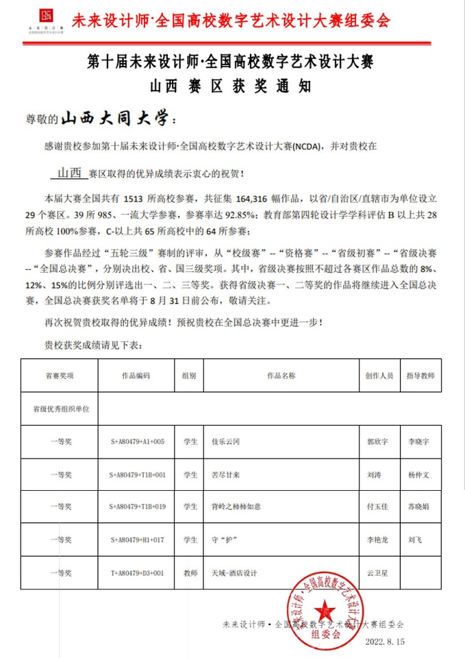 日前,接第十届未来设计师•全国高校数字艺术设计大赛组委会通知,我校yl6809永利集团师生参赛取得好绩,获奖19项。其中,在山西省赛区中,荣获一等奖5项,二等奖5项,三等奖7项;在全国总决赛中,荣获二等奖1项,三等奖1项。我校荣获“省级优秀组织单位”称号。