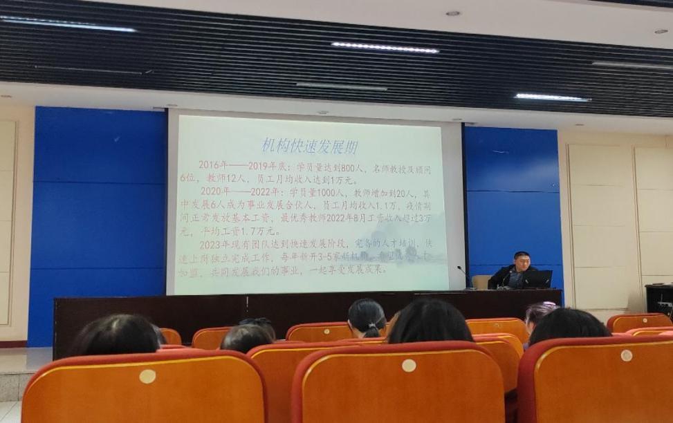 师晋斋公司贾小鹏老师,从“公司简介和发展”到“教学理念”、“组织架构”到同学们最为关心的薪酬待遇进行了细致的讲解。同时,展现了该公司自成立以来,秉持着“走出去,请进来,沉下去”的发展战略,将公司精心打造为一流教育品牌,开拓一流教育市场的历程。