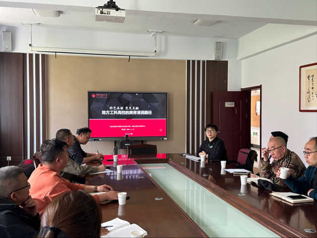 讲座中,以《“科艺共创 交叉互融”地方工科大学的美育浸润路径》为主题,韩冬楠院长美育浸润举措方面,介绍了开展美育大讲堂、举办美术校外展览、服务中小学及社区等措施,同时,与我院领导、教师代表进行了广泛而深入的交流。美育浸润在培养创新精神和创造力方面具有独特优势,通过艺术的形式表达自己的情感和思想,美育在学生全面素质、促进社会文明进步方面有重要作用。