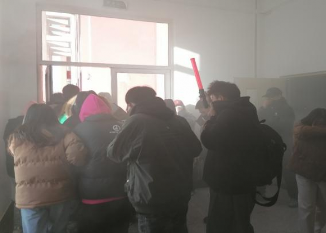 之后,利用烟雾弹模拟教学楼内发生火灾的情景,师生们在安全指挥员指挥棒的引导下,迅速有序地进行了疏散逃离。