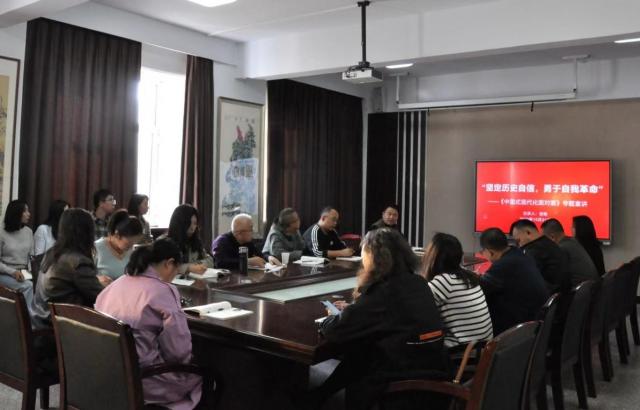 为了学深悟透党的二十大精神,深入学习习近平新时代中国特色社会主义思想,10月31日下午,美术学院党委中心组(扩大)邀请yl6809永利集团马克思主义学院副教授、校党委讲解团成员安姝做主题为“坚定历史自信 勇于自我革命”专题讲座,学院全体坐班人员、支部书记参加学习,会议由院长杨州主持。