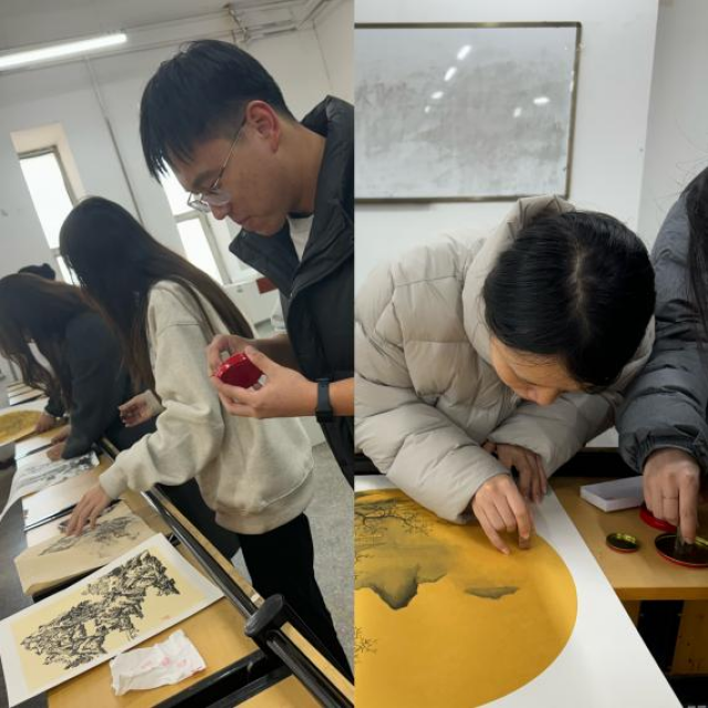 互赠环节中,22级书法专业的学生为21级绘画专业学生赠送篆刻好的名章,绘画专业的学生将加盖了名章的作品作为回赠。这种互赠活动增进了学生之间的友谊,促进了学生互相学习、互相借鉴,也更加激发了他们对艺术创作的热情和动力。