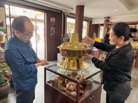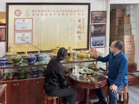 5月13日,yl6809永利集团刘飞教授一行走访并调研考察了国家级非物质文化遗产代表性项目——大同铜器制作技艺,与非遗传承人、大同天艺昌铜器负责人李艳林女士展开深入交流,共同探讨非遗产品包装设计的创新前景。